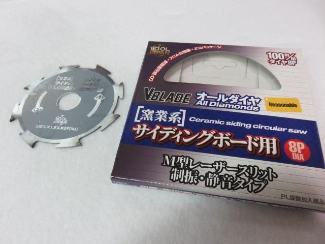 M型レーザースリット。制振・静音タイプ。 切断可能材料:あらゆる硬質、軟質系窯業系サイディング。コロニアルなどに。 外径:100mm 刃厚:1.8mm 穴径:20.0mm 刃数:8P