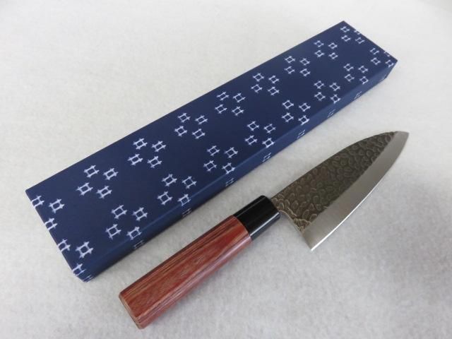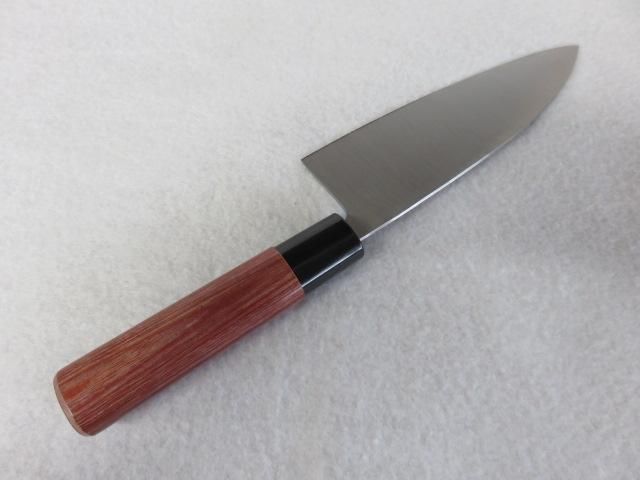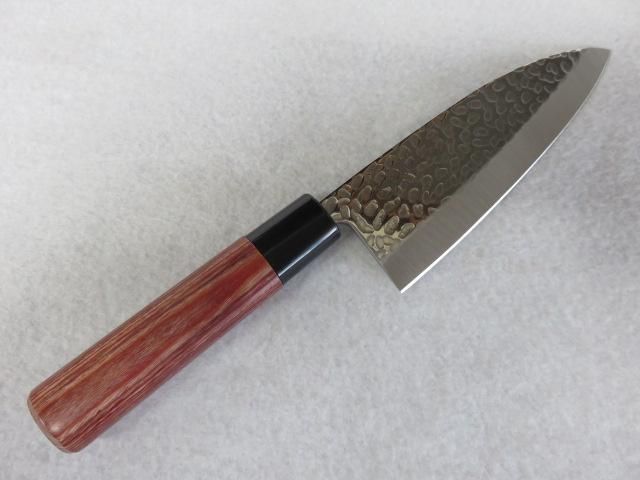 鋼材はステンレス刃物鋼(SUS420J2鋼)を使用した包丁です。硬さ・耐摩耗性に優れ、耐食性があります。外側は見た目も美しい鏡面鎚目仕上げです。錆びにくいです。柄は茶合板柄、PC桂付きです。 質量:約184g 刃渡り:約163mm 全長:約290mm 産地:岐阜県関市